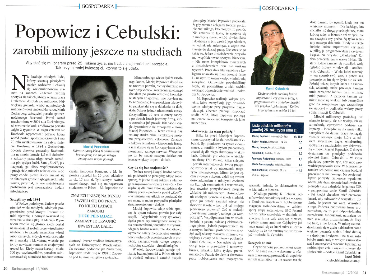 Kamil Cebulski uplasował się obok takich gwiazd jak Robert Kubica (kierowca F1), Maciej Lampe (były koszykarz NBA), Agnieszka Radwańska (tenisistka), Marta Domachowska (tenisistka) czy też Maciej Popowicz (twórca serwisu społecznościowego nasza-klasa.pl).